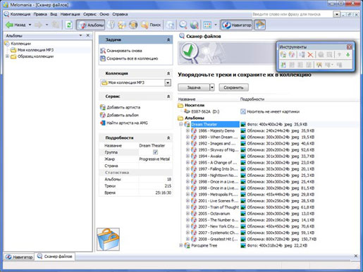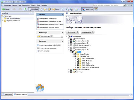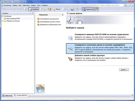Сразу хочу обратить внимание на то, что абсолютно все данные, вносимые в коллекцию, начиная с названий треков и заканчивая обложками дисков, хранятся внутри файла коллекции. Это очень удобно, так как снимает вопрос о переносе коллекции с компьютера на компьютер, а также решает проблему сохранности данных при переустановке операционной системы - нужно просто скопировать нужный файл в надёжное место, и за сохранность информации можно не опасаться. Но вернёмся к вопросу заполнения коллекции. Запустим инструмент под названием «Сканер файлов» и рассмотрим предложенные в нём варианты.